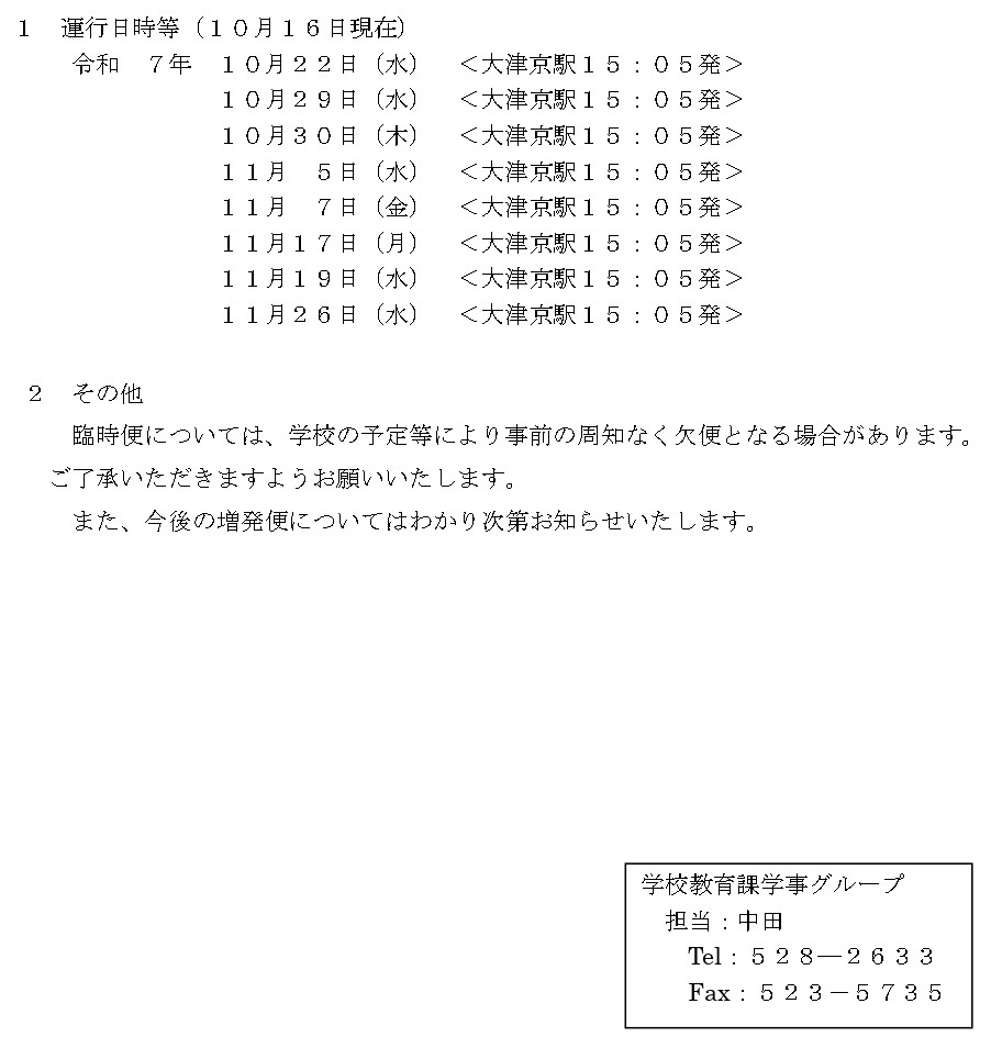 2025.10.20 お知らせ バス臨時便(2025/10/20 更新) ad ◎臨時便は普段の便と同様に誰でも乗車OK!運賃も変わりません。◎今後もこの体制は続きます。◎資料以降の臨時便については連絡があり次第、周知します。